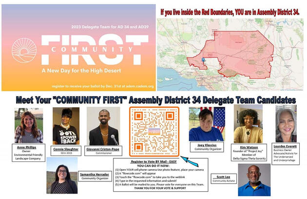 **Our mission is to be responsive ambassadors between the community and the California Democratic Party, working to build unity and strengthen voter engagement in the High Desert. We strive to intentionally empower and engage our youth and other marginalized groups to create lasting change. **Community First's candidates are High Desert labor & education leaders, as well as political and social activists & organizers.**We value the intersectional diversity of our community and we’ll prioritize listening and supporting those voices to be truly representative delegates. Delegates have a responsibility to show up and be active participants, setting an example for fellow Democrats. We are committed to building on our work, activating the collective power of our community, and continuing to make a positive impact in the High Desert. **